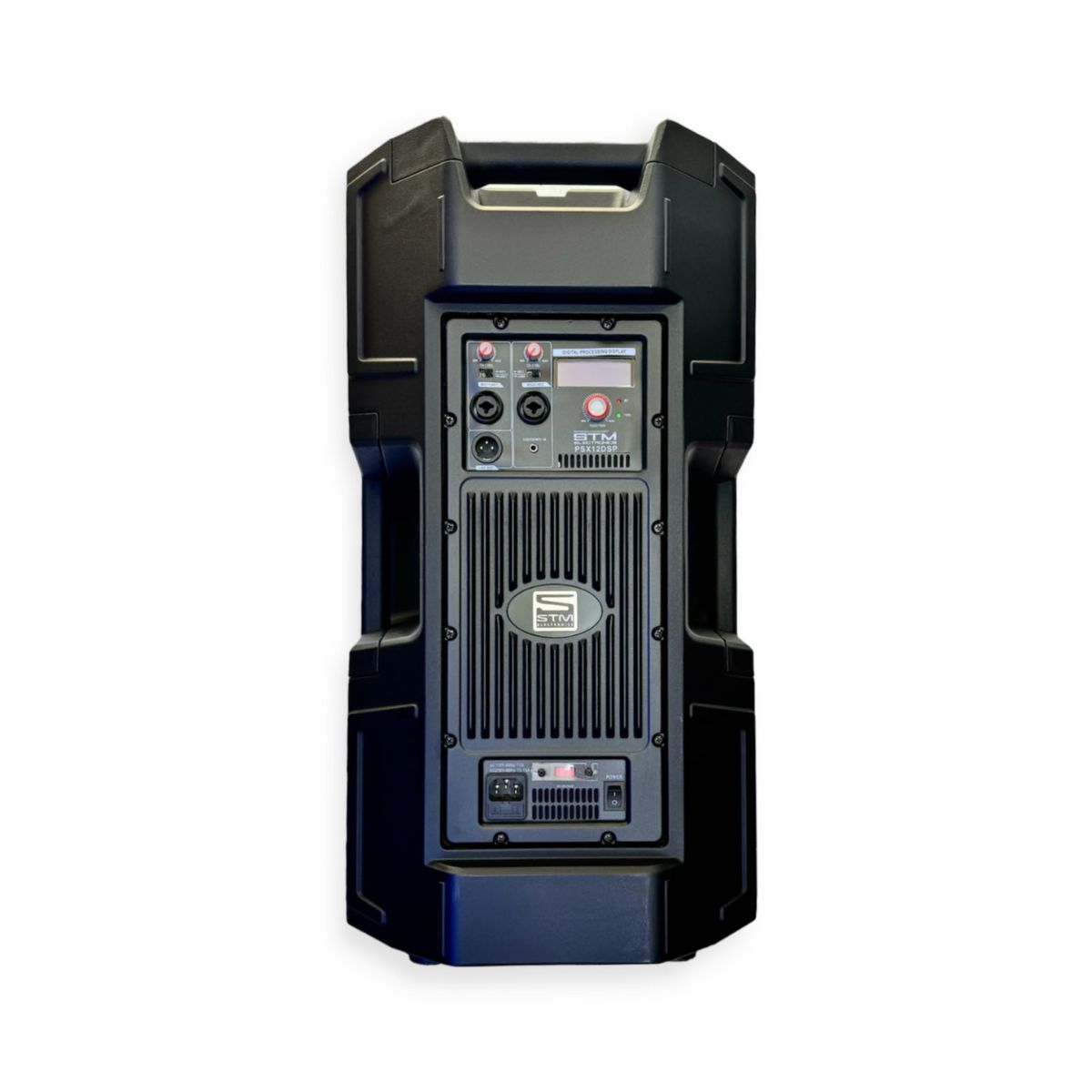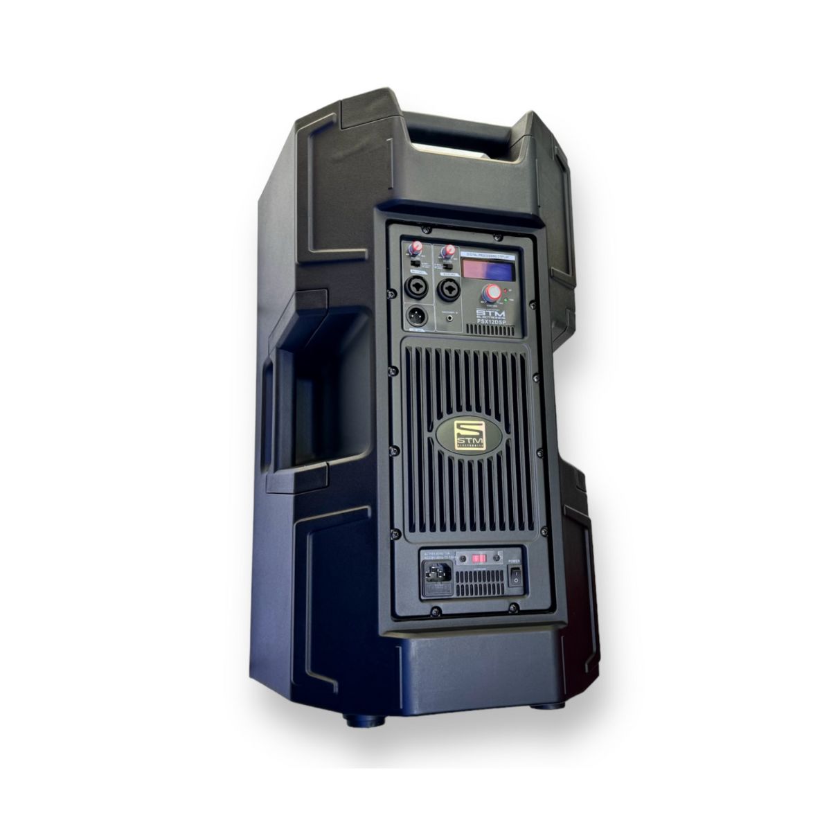 Parlante amplificado profesional de 12″ STM PSX12, con amplificación integrada y diseño robusto, ideal para refuerzo sonoro versátil en eventos, presentaciones y aplicaciones móviles.